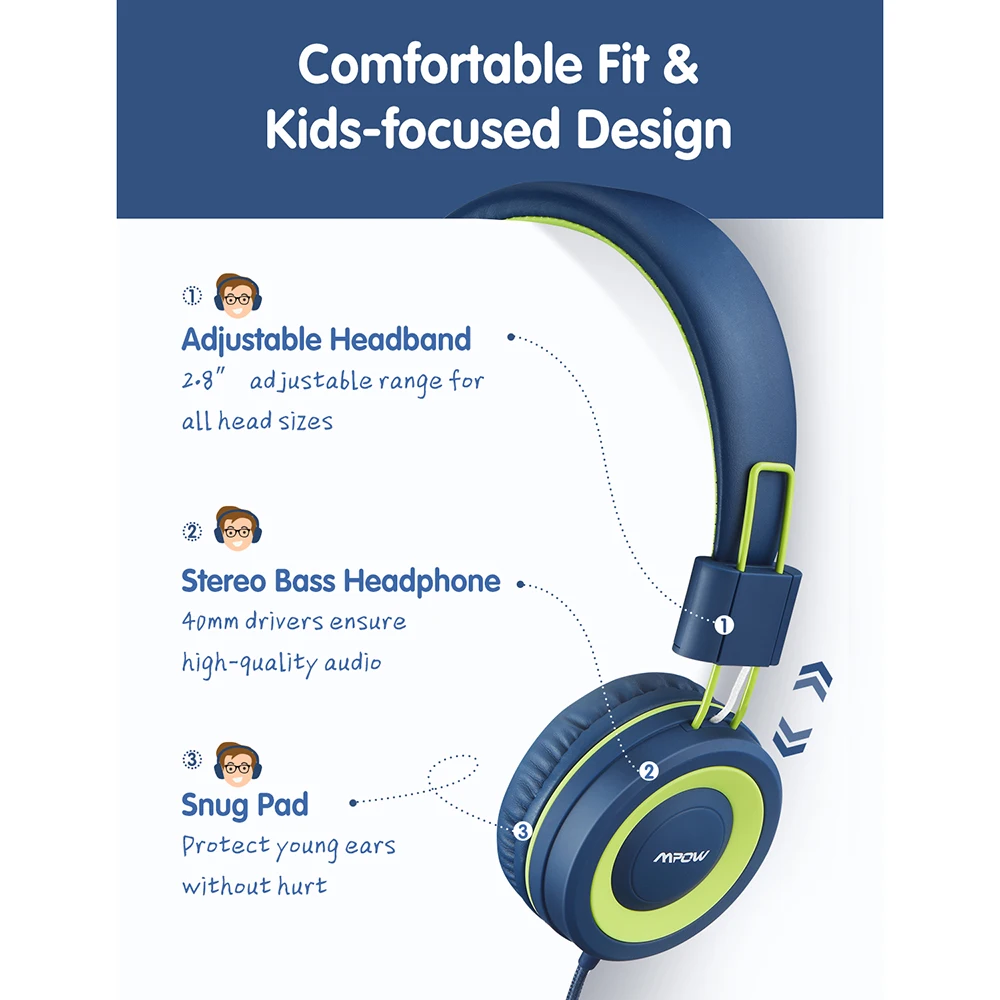 Mpow CH6 Wired Kids Headphones Foldable Adjustable Wired Headphone With 3.5mm Audio Jack And Microphone For Children For iPod : Click Here Mpow CHE1 Kids Headphones Boys Girls Wired Headset With Mic Volume Limit Adjustable Headband On Ear Headphone For Teens Children : Click Here Mpow CH9 Bluetooth Kids Headphones Foldable Headset With Microphone LED Light 85dB Volume Limit For Children Boys Girls Teens : Click Here